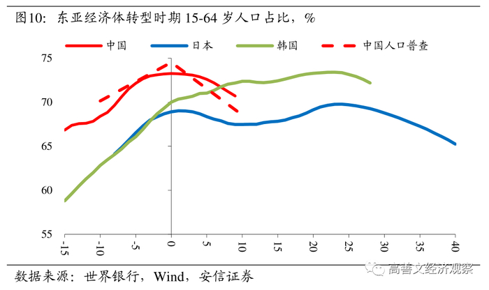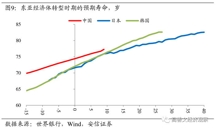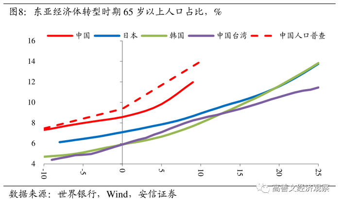 无论是年度数据还是普查数据,转型后的中国老龄化均出现了加速的现象,且这一加速相比其他东亚经济体而言要来得更早。这固然与中国实施计划生育政策有关,但考虑到在对标时点下,中国处于医疗水平较高的时代,因此预期寿命也比转型同期的日韩水平要高。