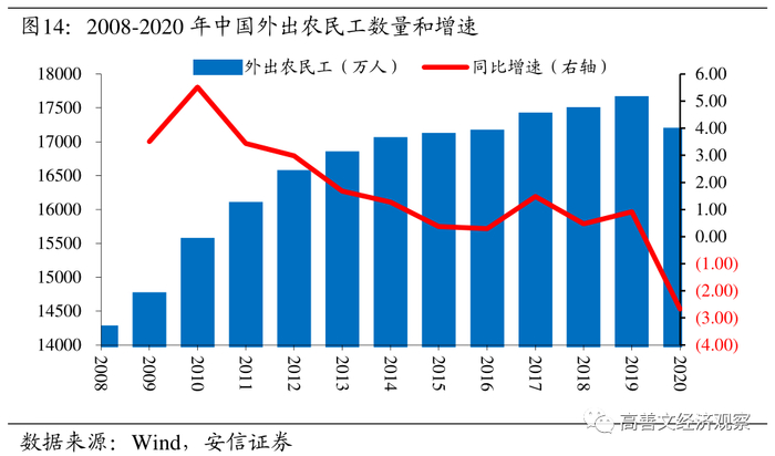 另外,从外出农民工以及移民等相关人口数据来看,面对劳动力人口数量的走弱,我国未来难以通过境内外劳动力的转移来进行对冲。