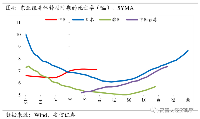 而从中国转型时期的死亡率来看,其绝对水平与同期的日韩相似,但在变化方向上却呈现出相反的中枢抬升趋势。结合中国出生率的走低、老龄化的加重,以及其他东亚经济体死亡率的历史变化模式,或许当前中国的死亡率已经处在拐点的右侧,即不断向上的过程之中。