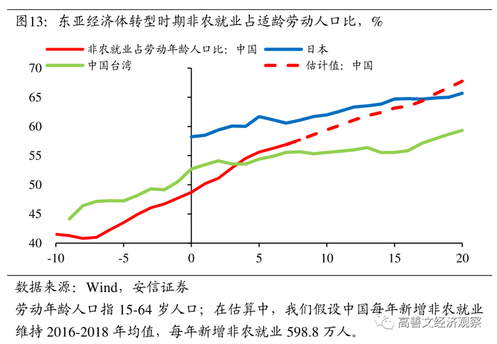 二是观察图13的虚线。这些虚线的基本想法是,如果中国城市经济部门第二、三产业每年创造就业机会的能力维持在2016-2018年的平均水平,我国非农就业占全部劳动年龄人口的比例将逐步超过日本同一发展阶段的水平。
