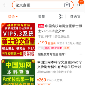 ▲在电商平台上以“论文查重”为关键词进行检索,发现有不同商家提供查重服务。图片来源:某电商平台截图