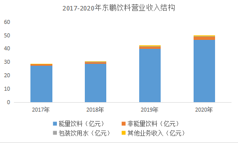 东鹏饮料的主营业务为饮料的研发、生产和销售,主要产品包括东鹏特饮、由柑柠檬茶、陈皮特饮、包装饮用水等,其中东鹏特饮是公司的主导产品。2020年,东鹏特饮营收46.55亿元,在公司整体中占比为93.88%。