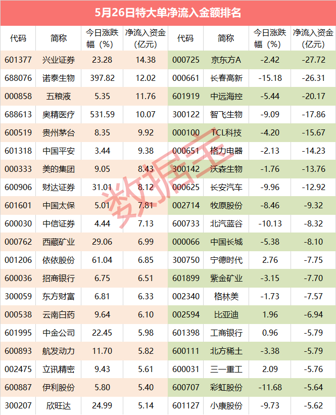个股来看,两市有106只股票获特大单净流入超1亿元。兴业证券特大单资金净流入居首,为14.38亿元。紧随其后的有诺泰生物和五粮液,分别净流入12.02亿元和11.76亿元。