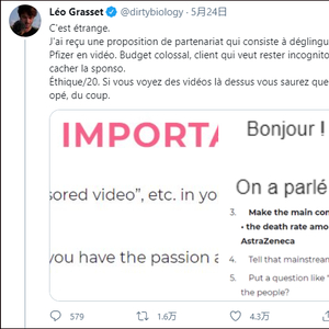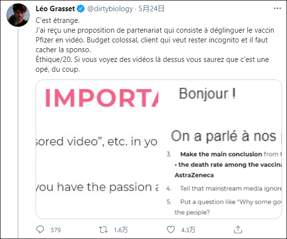 此外,法国南部一名拥有数万名粉丝的实习医生告诉法国BFMTV电视台,也有人联系他发视频抹黑辉瑞疫苗,一段30秒的视频出价2000欧元。