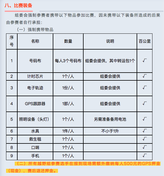 “偶尔治愈”查询发现,赛事组委会规定的参赛者必须强制携带的装备,不包括保暖物资。风衣、冲锋衣、保暖内衣、急救包等,属于“建议携带装备”。