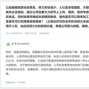 5月25日,新希望在互动平台表示,“根据目前对多种所谓人造肉的了解,甚至是对那家名声远播的美股公司产品的亲身试吃,人造肉相比真实的肉类在口感、味道上还有很大的差距,在成本上也没有优势,反而更贵。所以我们认为,在较长的时期里,人造肉只是满足特殊群体特殊需求的一种小众产品,不会对大众肉食消费带来很大的影响”。