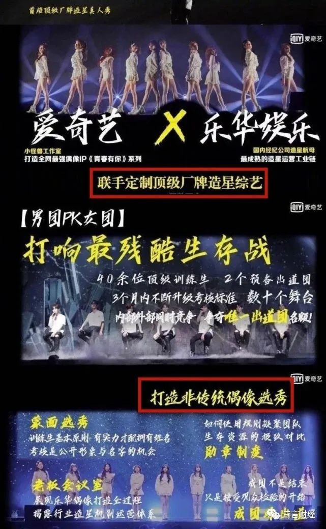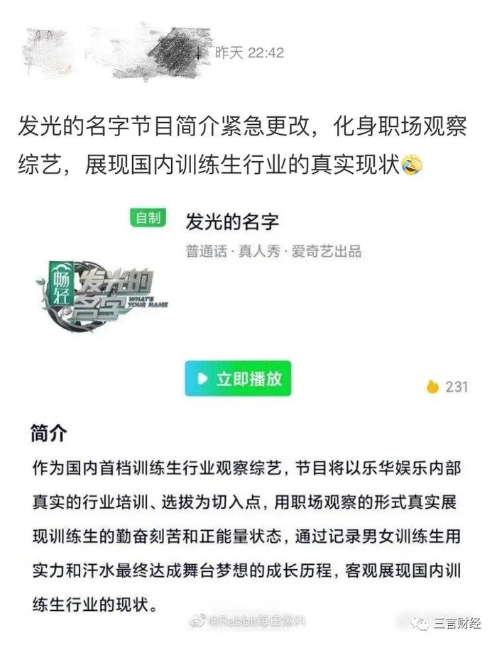 首先,三言财经发现,爱奇艺上《发光的名字》简介确实是:训练生行业观察综艺,节目将以乐华娱乐内部真实的行业培训、选拔为切入点,用职场观察的形式真实展现训练生的勤奋刻苦和正能量状态。