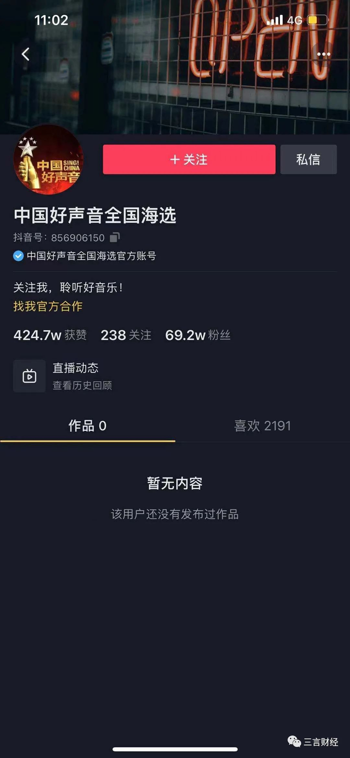 《中国好声音》全国海选官方抖音号清空了所有作品。