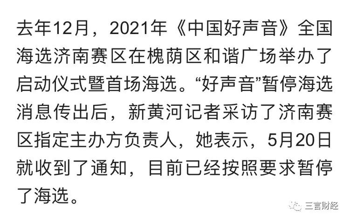 此外,新黄河客户端的记者对济南赛区进行了咨询,济南赛区表示,5月20日接到了通知,目前已经按照要求暂停了海选。