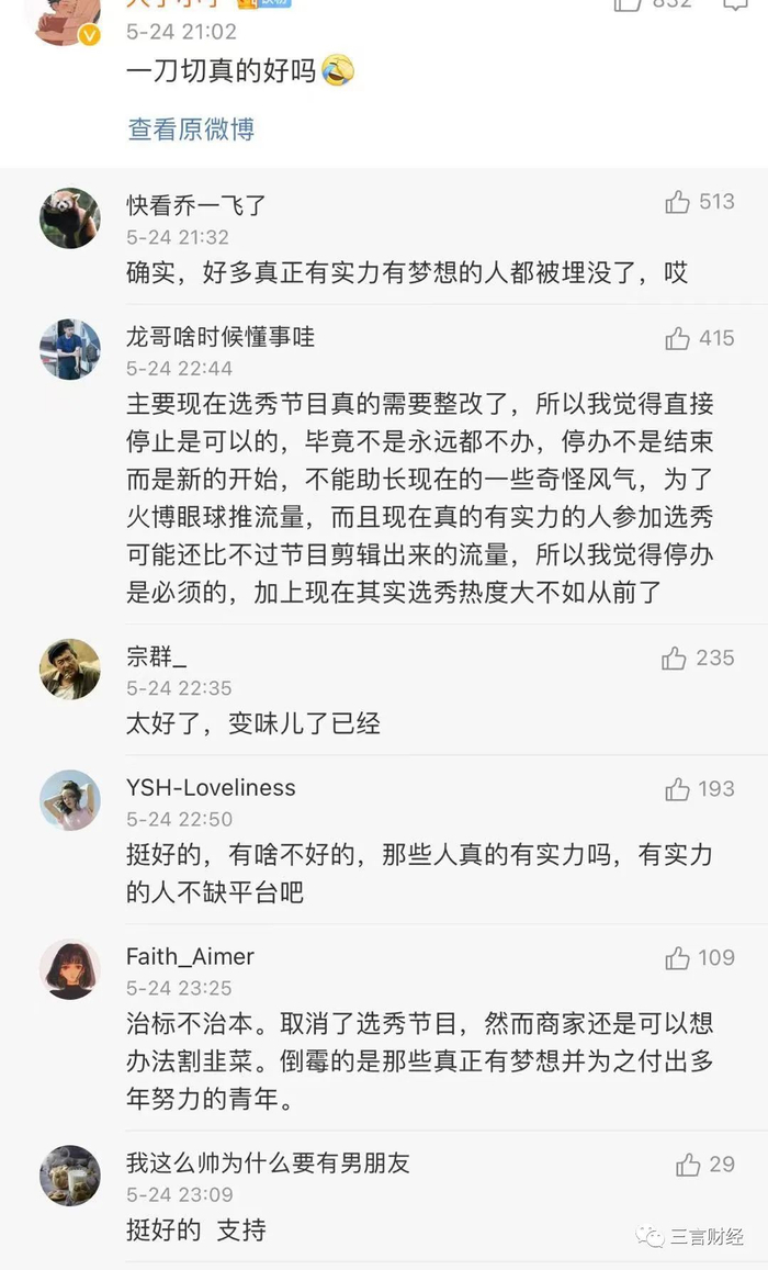 有网友认为挺好,选秀节目确实需要整改,不能助长现在的一些奇怪风气;也有网友认为治标不治本,商家还是可以想办法割韭菜。