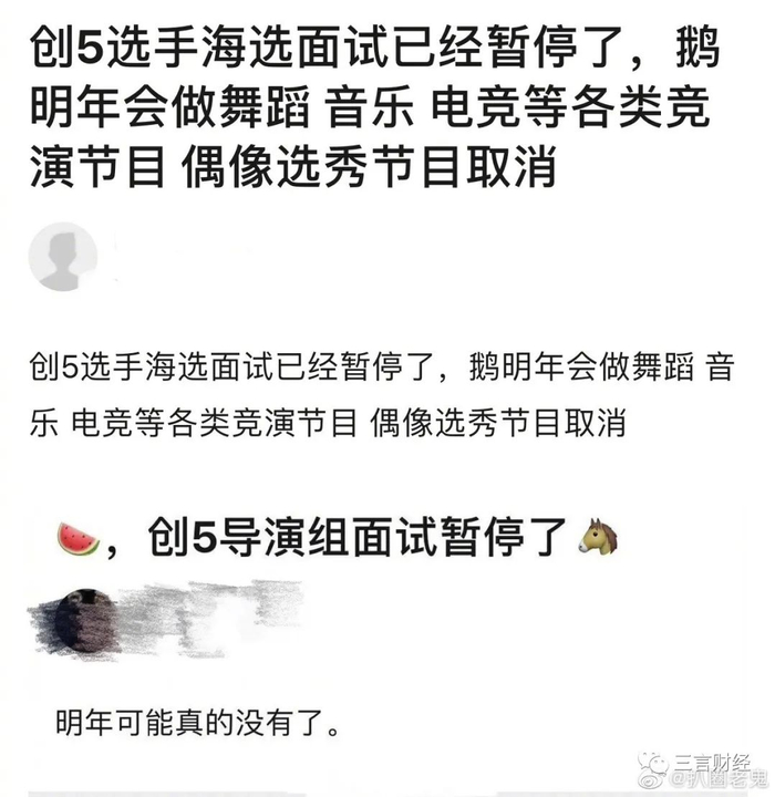 消息传出后,有网友称《创造营5》的选手海选面试也已经停止了,官方明年会做舞蹈、音乐等各类竞演节目,偶像选秀类节目取消。