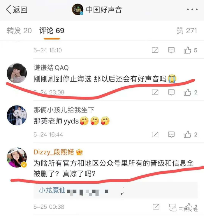 中国好声音官方微博的评论区,也有很多网友留言询问:“以后还有好声音吗?”、“为啥海选和晋级信息都被删了?”