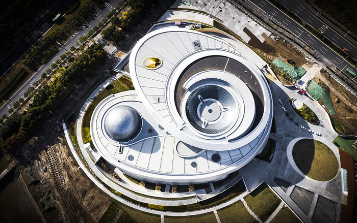 上海天文馆与滴水湖相望,建筑外形以引力作用下天体的螺旋运动为形象,选取象征性的“三体”建筑构件。主建筑外的景观区域还设计了4条螺旋形的步道,从主建筑向外自然延伸出去,象征着星系的旋臂,并与外围的“星空之境”湿地公园和谐地形成了一个以星空为主题的城市绿地公园。上海天文馆以“全景式、多感官”为展示特点,包括“家园”“宇宙“征程”等三个主展区,设有289个展项总数和346组图文总数,将全面展示世界最新天文研究热点和成果、全球最新天文装备和计划。天文馆将随时更新播报最新的天文进展,馆内设有国内口径最大科普望远镜、专业级太阳望远镜、全球最先进的新型光学天象仪、超高清多功能球幕影院等大型专业设施。