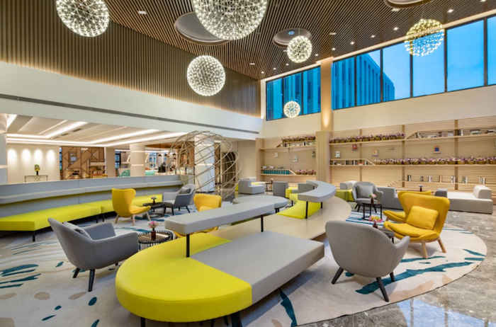大堂承载着酒店形象、宾客休憩等功能。假日酒店大堂将工作、社交与休闲活动空间融为一体,无论是一个人想稍作休息,还是三五好友想欢聚片刻,抑或是周末假期亲子互动,假日酒店大堂都可以满足。
