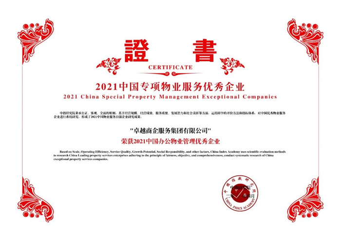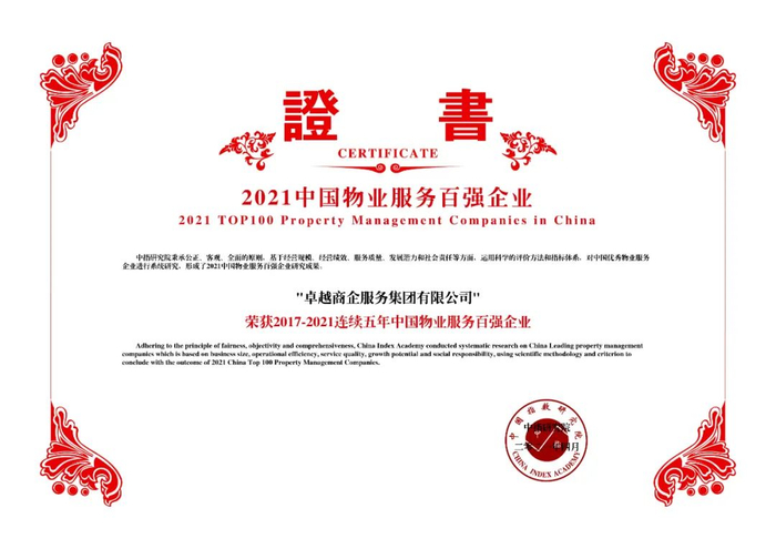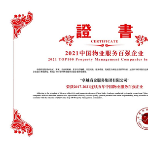 卓越商企服务集团有限公司凭借业内领先的综合实力和服务水平,荣膺“2017-2021连续五年中国物业服务百强企业”,并在专项物业服务领域研究中荣获“2021中国办公物业管理优秀企业”,旗下卓品商务服务有限公司荣获“2021中国物业服务多种经营优秀企业”。