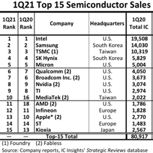 昨日,知名分析机构ICinsights发布了全球前15大半导体公司在2021年第一季度的表现状况。
