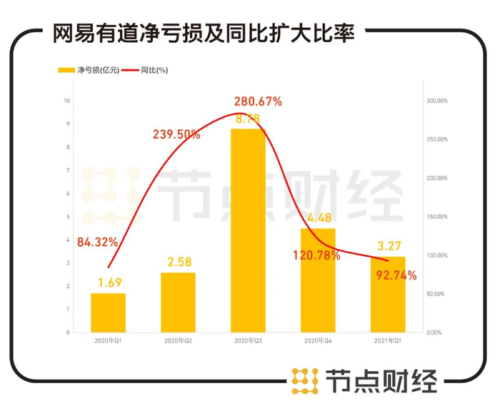 虽然毛利率很高,但是网易有道依旧在亏损。2021年Q1,网易有道净亏损3.27亿元,同比扩大92%。