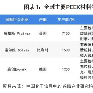 从全球范围来看,PEEK最初由英国帝国化学工业(ICI)于20世纪70年代末开发,随后其PEEK业务被英国的威格斯Victrex收购。目前,威格斯是全球最大的PEEK生产商,产能约为7150吨/年,其次是比利时的索唯亚Solvay(产能达1500吨/年)与德国赢创Evonik(产能约1250吨/年),以上3家企业集中了全球80%以上的PEEK材料产能。