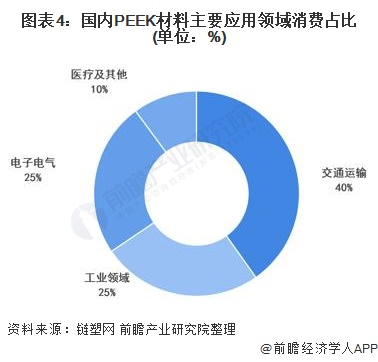 从应用领域来看,目前国内交通运输行业约占PEEK树脂材料消费总量的40%,工业领域占25%,电子电气占25%,医疗及其他市场约占10%。PEEK材料优异的综合性能符合交通运输行业轻量化需求,也符合电子元器件集成化、小型化的发展趋势。