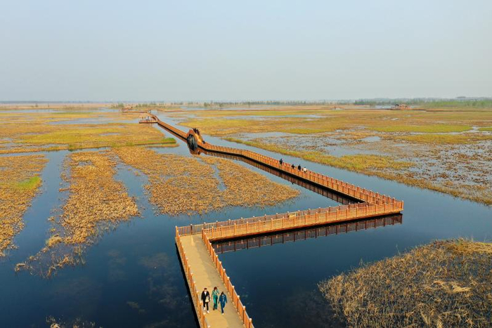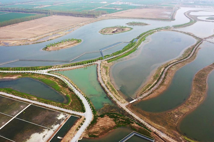 △白洋淀西南侧的入淀河孝义河河口,214个巨大方格组成的“潜流湿地”,将孝义河上游下来的每天20万吨劣五类污水处理尾水予以净化。(李茂君 摄)