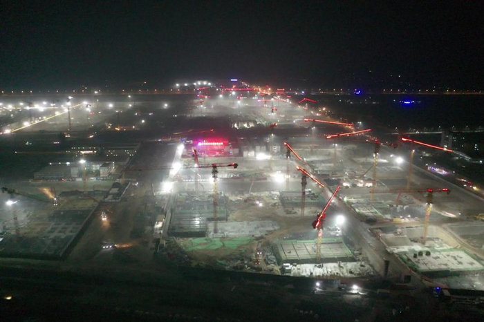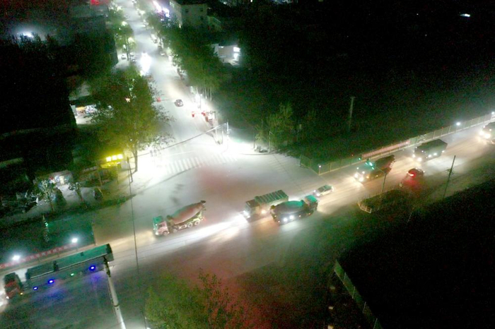 △入夜后,雄安新区容西片区的街道上运送建筑物资的车辆来回穿梭不停。(李茂君 摄)