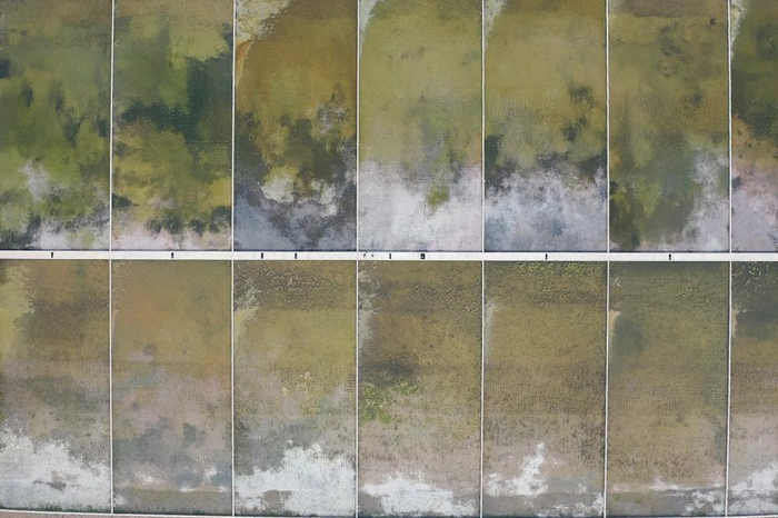 △孝义河河口湿地治理项目航拍图。图上左下方一格格的为“潜流湿地”,左上方大面积的为“沉水植物塘”。可以明显看得出水质经不断过滤后明显改善。(李茂君 摄)