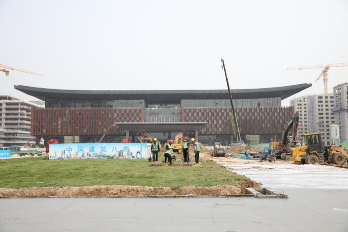 △图上的黑色挑檐建筑,是雄安新区商务服务中心内的核心建筑会展中心,目前已建成正进行内部装修。(李茂君 摄)