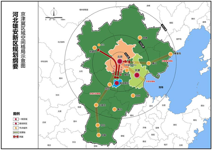 而另一翼雄安新区,地理上的选址也十分微妙。它位于北京、天津、保定三地的中心位置,将雄县、容城、安新三县覆盖进去。它距离北京够近,100公里的距离在北京的可辐射范围内,京雄高铁50分钟即可抵达;它又距离北京够远,远到不会成为一个超级城市快速蔓延的副产品。它“落子”后,恰好将京津和石家庄、邢台、邯郸的南线“连”了起来,这样才可能形成一个新的增长极。