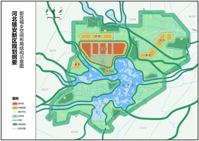 △雄安新区城乡空间布局结构示意图。上述航拍图均摄自“起步区”上方的“容城”外围组团。(摘自河北雄安新区规划纲要)
