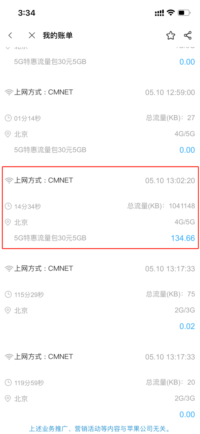 此后,李女士在北京移动APP上找到了当月的扣费明细。账单显示,套餐外上网费共为172.76元。具体大面额扣费的时间段为13:02后的14分34秒,共消耗流量1041148kb,产生费用为134.66元。