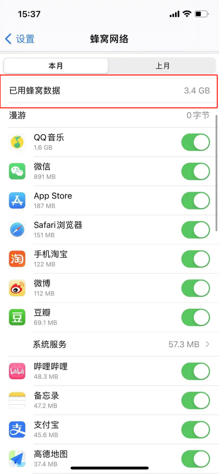 此外,据李女士透露,当时手机除了重复播放同一首歌,后台运行的均为微信、豆瓣等流量消耗较低的软件。并且,截至采访时,李女士的手机显示当月以用蜂窝数据仅为3.4GB,而其使用的套餐为“5G特惠流量包30元5GB”。若按此看,李女士已使用流量并未超过套餐流量。