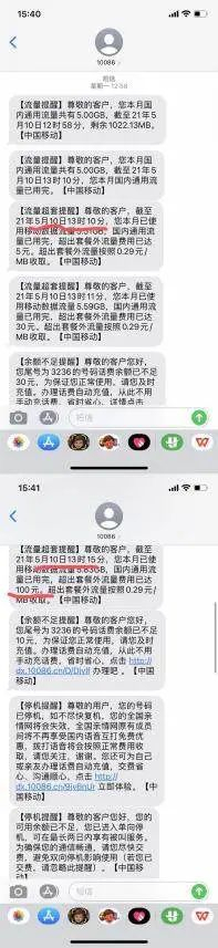 还有用户发布截图显示,于5月1号上午11:39开始超出流量套餐,但在晚上23:39才收到中国移动流量超套提醒的信息。这期间,该用户一共产生了500元的流量使用费。