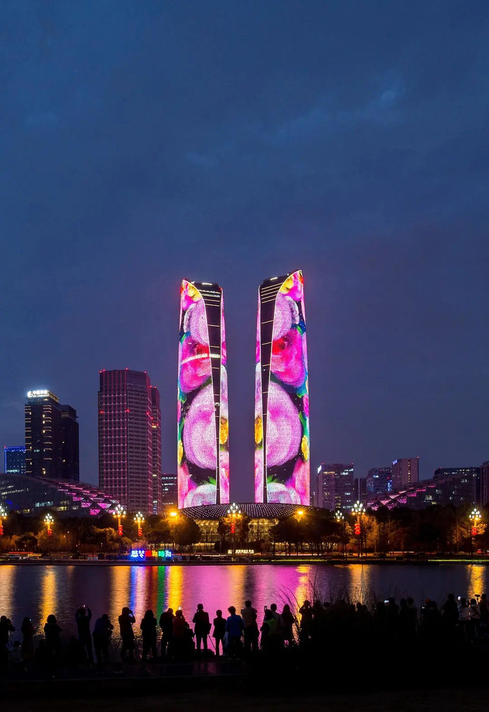 ▲成都高新区交子公园金融城双塔亮灯 王效 摄