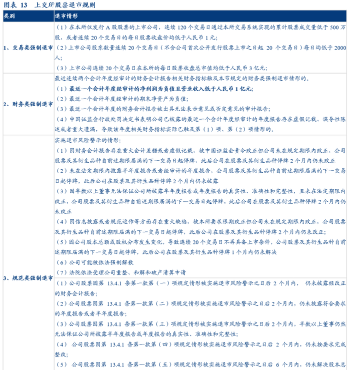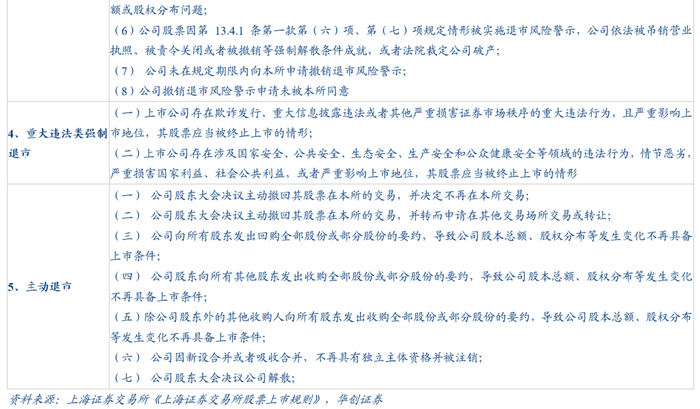 此次《股票上市规则》的修订,关于退市制度部分的分类及编写体例,将退市情形按照指标类别分为交易类、财务类、规范类和重大违法类四大类,并按类别分节撰写相关退市情形和实施程序。另外,本次修订,对四种类型的退市指标均有优化和修改。上市公司触及规定的退市情形,导致其股票存在被终止上市风险的,对该公司股票启动退市程序。退市包括强制终止上市(简称强制退市)和主动终止上市(简称主动退市)。强制退市分为交易类强制退市、财务类强制退市、规范类强制退市和重大违法类强制退市等四类情形。