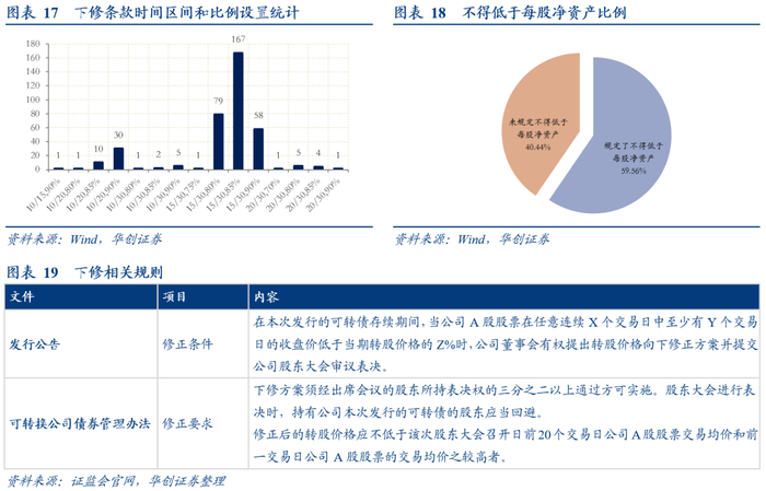 下修条款:条款范式统一,在时间区间和价格比例设置上略有不同。下修博弈胜率较高。但下修属于发行人的权利,是否下修以及下修时间窗口难以把握。下修背后的原因也多种多样,整体可归纳为主动下修和被动下修。