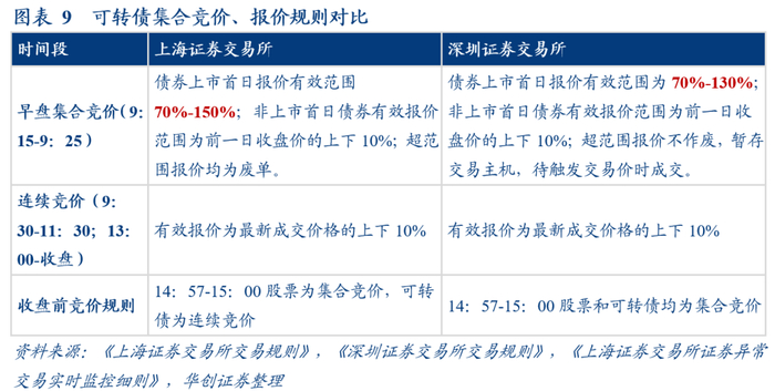 可转换债券的报价、交易、临时停牌等规则主要依据《上海证券交易所交易规则(2020年第二次修订)》、《上海证券交易所证券异常交易实时监控细则(2018年修订)》、《深圳证券交易所交易规则(2021年3月修订)》等文件。沪深两市对债券实现日内回转交易,因此可转债进行“T+0”交易,且可转债属于无涨跌幅限制的证券。但沪深两市在具体的交易环节和报价范围等方面略有不同。