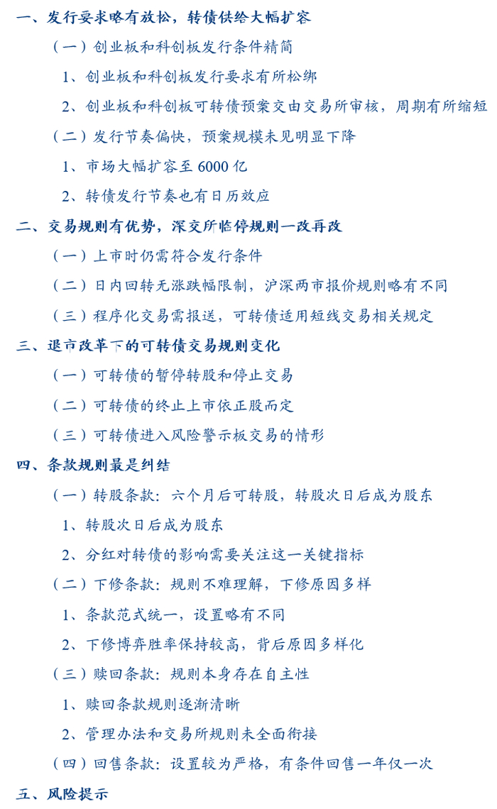 赎回条款:《可转换公司债券管理办法》中对赎回条款作出了诸多规定,使得赎回规则逐步清晰,而现行规则下赎回条款规则本身仍有一定自主性,与《可转换公司债券管理办法》中的要求未做全面衔接,后期交易所规则若有进一步修订,这些自主性和不确定性有望得到消除。