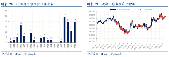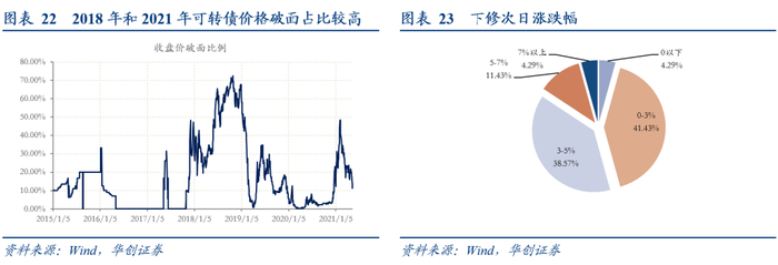 2018年之后下修频次有所增加,2017年之后市场存续转债支数较此前大幅增加。其中2018年、2019年和2021年下修案例较多,2018年和2021年,可转债破面比例较高,2019年则是正股震荡走势。