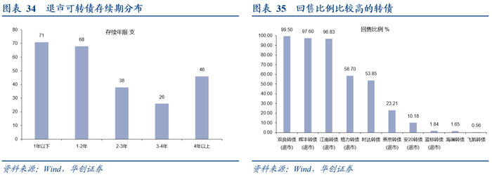 从下修条款和回售条款的设置对比可以发现,回售条款的统计时间区间和价格比例均较下修条款设置严格,触发难度大于下修条款,上市公司可以通过下修转股价来规避回售压力。此外,可转债多通过提前赎回促转股退市,已经退市的可转债的存续年限为2.3年左右,多数转债未进入回售期就通过提前赎回促转股退市,因而,整体回售率不高,仅双良转债、辉丰转债、江南转债、格力转债、时达转债5支曾发生过大比例回售。