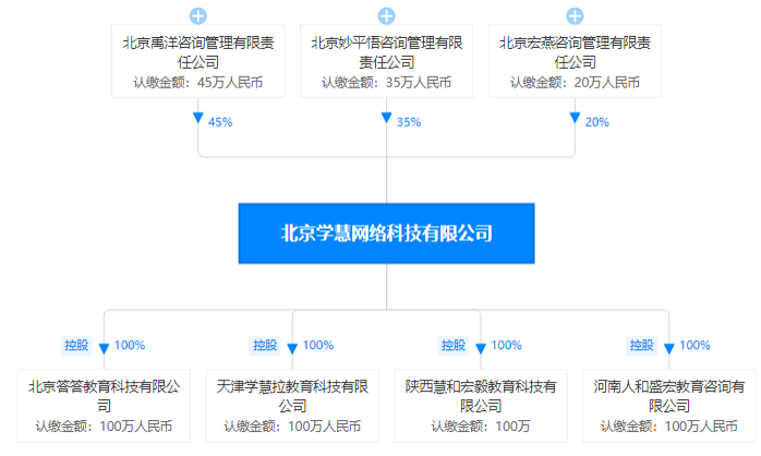 天眼查显示,“学慧网”运营主体为北京学慧网络科技有限公司,公司成立于2014年10月,注册资本100万元。北京禹洋资讯管理有限责任公司为持股45%的大股东,北京妙平悟资讯管理有限责任公司为持股35%的二股东,北京宏燕资讯管理有限公司为持股20%的三股东。