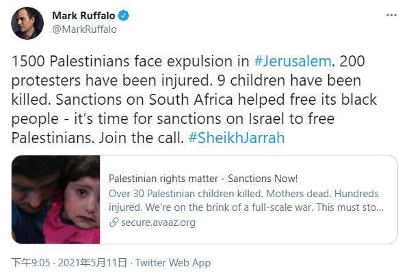 本月早些时候,鲁法洛呼吁对以色列采取经济限制措施,他在一条推文中写道:“对南非的制裁帮助解放了黑人——现在是制裁以色列来解放巴勒斯坦人的时候了。”他还在这条推文下面附上了一个请愿书的链接,该请愿书要求对以色列的关键行业进行国际制裁,“直到巴勒斯坦人获得完全平等的公民权利”。
