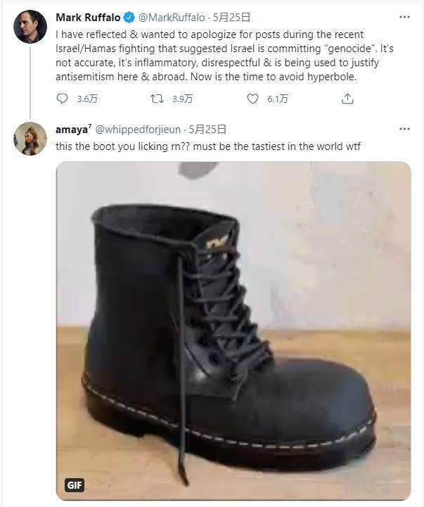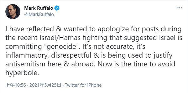 但在当地时间24日发布的一条推文中,鲁法洛试图澄清自己有关此次冲突的立场。他写道,“我已经反思,并想为自己在最近以色列和哈马斯冲突期间发表的,暗示以色列正在进行‘种族灭绝’的帖子而表示道歉。那是不准确的,是煽动性的,无礼的,并且在美国国内外被用来为反犹太主义辩护。现在是时候避免(事态)继续扩大了。”