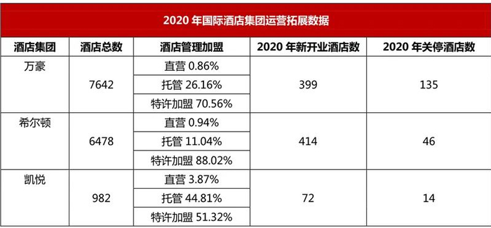 从国际酒店集团2020年新开业门店数据来看,全球范围内持续的疫情造成其新开业门店数量较上年大幅降低。万豪2020年新开业门店数量为399家,仅为2019年516家的77.33%;希尔顿为414家,是2019年470家的88.09%。从国际酒店集团资产管理模式来看,2020年万豪、希尔顿和凯悦的全球特许加盟酒店数量占全球总酒店数量的比例分别是70.56%、88.02%和51.32%,特许加盟酒店数量在各个集团全球门店总量中占比最大。与轻资产管理模式中的委托管理相比,特许加盟盈利规模主要和门店数量相关,因此受行业波动影响程度较小,与日常经营成本的脱钩使得加盟业务拥有更大的盈利空间和抗风险能力。