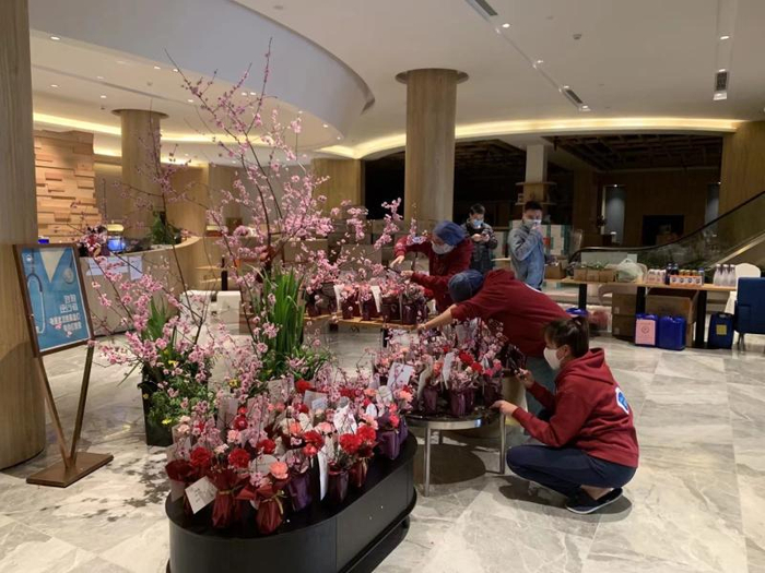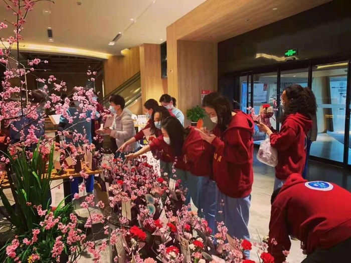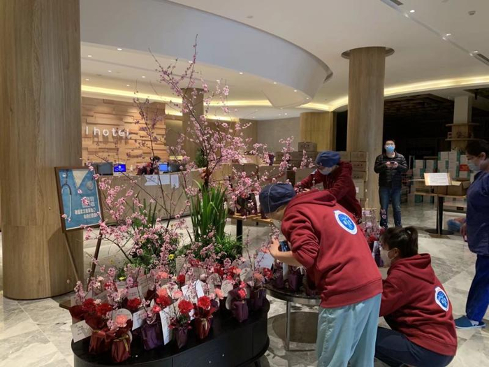 那天,长期弥漫着消毒水味道的酒店大堂里,突然有一股梅花的自然清香飘散开来,让略有些沉闷压抑的气氛一下子有了抹生机勃勃的亮色。“当时的场景令人动容:在美人梅的插花造景作品前,医护人员们纷纷举起手机拍照,还用手比着象征胜利的手势,笑着和美人梅自拍;在96个花束中,不少医护人员寻找着写有自己名字的祝福卡片,找到后异常开心,对着我们说谢谢。其实,是我们应该谢谢他们:脱下防护服、摘下口罩,这些援鄂医疗队的队员们,多数也是爱美、爱花、爱自拍的年轻姑娘,但在疫情面前,她们却挺身而出、成为凡人英雄,携起手来帮助一座城市克服了难关。”说到这里,苏艳玲的眼眶红了。