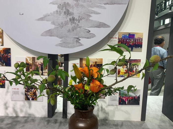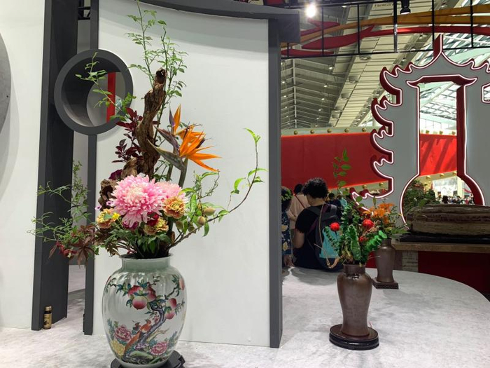 花博园复兴馆湖北馆内,进门处摆放着一排生机盎然的插花作品,花卉簇拥着十来张题为“武汉,加油!”的照片。照片上,一个个医护人员戴着口罩,一手拿着大捧鲜花,一手拖着行李箱,对镜头微笑——这是去年春天时,来自全国各地的援鄂医疗队完成救援任务后离开武汉,武汉市民为他们献花送别的情景。“千言万语说不尽一句‘谢谢’,一切感情都在花里。”湖北省花木盆景协会插花分会副会长苏艳玲对记者说。