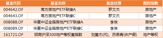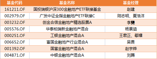 主动管理基金主要有工银金融地产混合、创金合信金融地产、华泰柏瑞新金融地产混合、中银金融地产等。