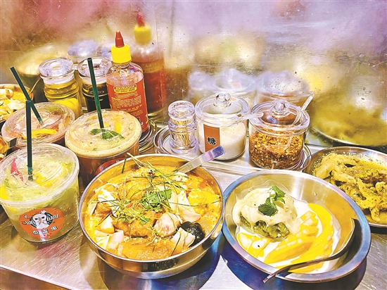 “泰盏鬼”主打冬阴功汤粉,与传统做法不同的是,这里配有加料区,里面虽然只是肠仔、虾丸、鱼蛋之类的“火锅料”,但这些配料一旦放进碗里吸饱汤汁之后就会非常美味。“这里冬阴功汤味道偏淡,不过胜在配料多,吃起来的口感还是挺丰富的。”美食达人陈小姐说,这里的招牌饮品“颓废冬阴辣柠茶”味道有点怪,冬阴功的味道不太明显,但有一点点辣椒的香味也颇为有趣。
