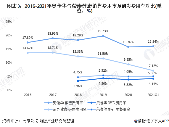 营销和核心技术研发是按摩器企业发展的两大制胜点;营销对于提升品牌知名度以及品牌形象塑造有着重要的作用,例如2020年双十一销量暴涨的SKG按摩仪,就是通过各大线上营销以及聘请拥有高流量的代言人瞬间抓住了年轻消费者的眼球。从销售费用率来看,2016-2021年第一季度奥佳华的销售费用率在15%-20%之间;荣泰健康的销售费用率在7%-14%之间,奥佳华的销售费用率持续高于荣泰健康。