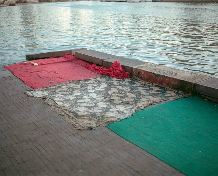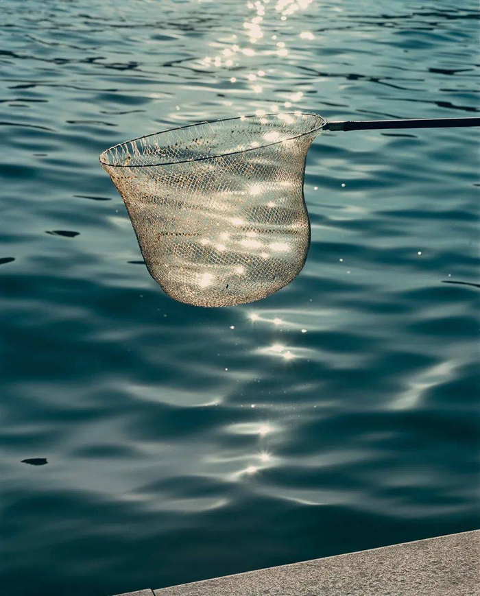 河边的渔网千奇百怪,可以看出很多网都是捕鱼者自己制作的,网的材料与颜色,网眼的粗细都各不相同。渔网在水面天空的倒影中,在阳光与水面的反射的光中穿行,投下一些抽象的影子。