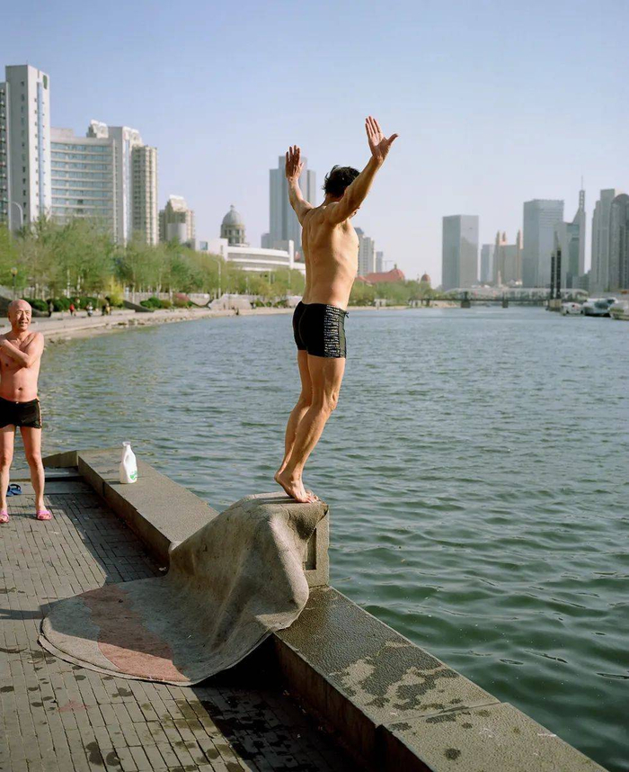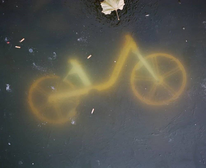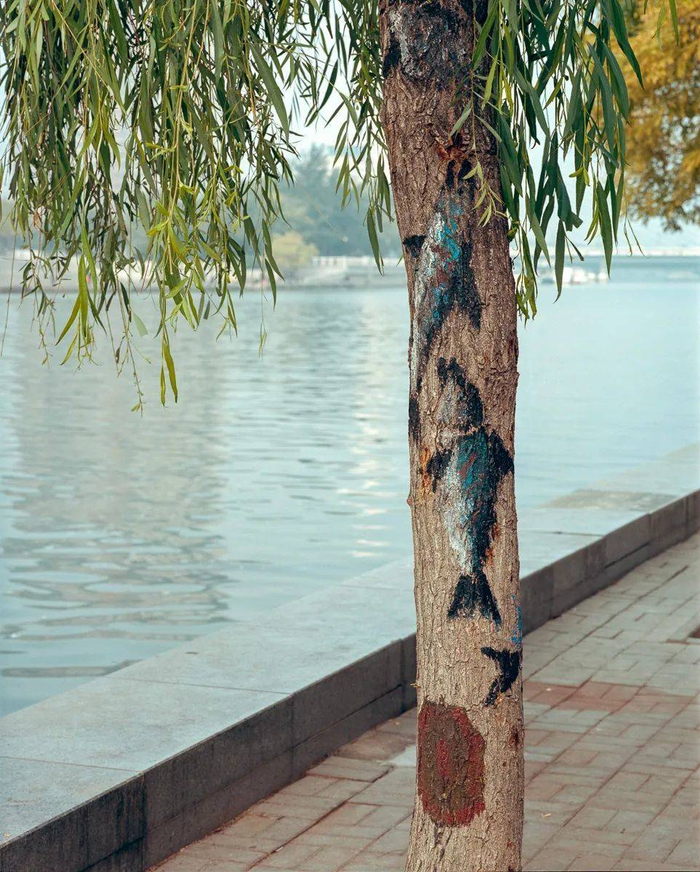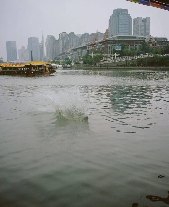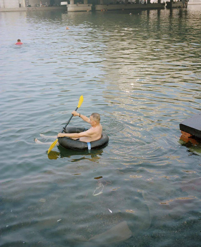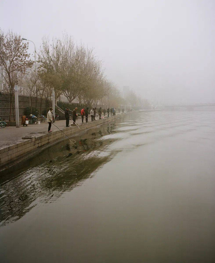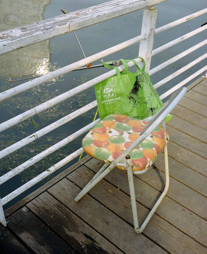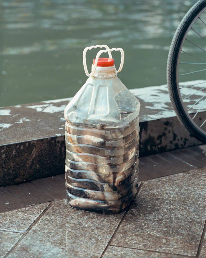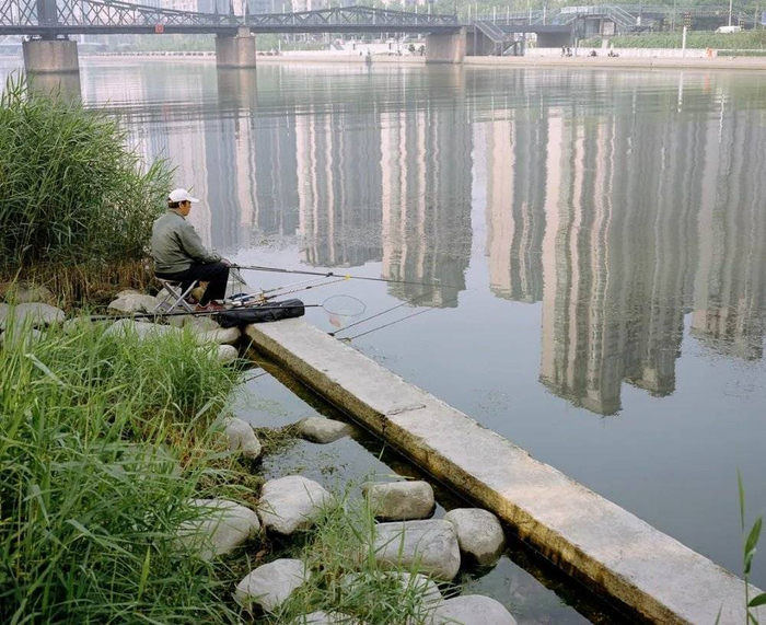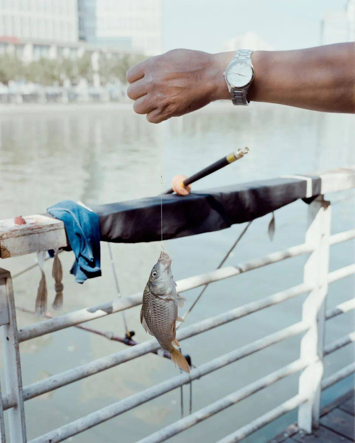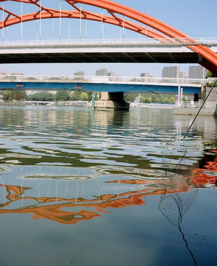 年纪比较大的,看起来已经退休的男人们,喜欢骑着自行车或者小电驴,带着马扎和保温杯,聚集在一起,用钓竿慢慢钓鱼。不在饭点的时候,也能看到一些年轻人,把电动车停在河边,拿出一个网开始捞鱼。电动车后面的箱子上写着 “美团外卖”。